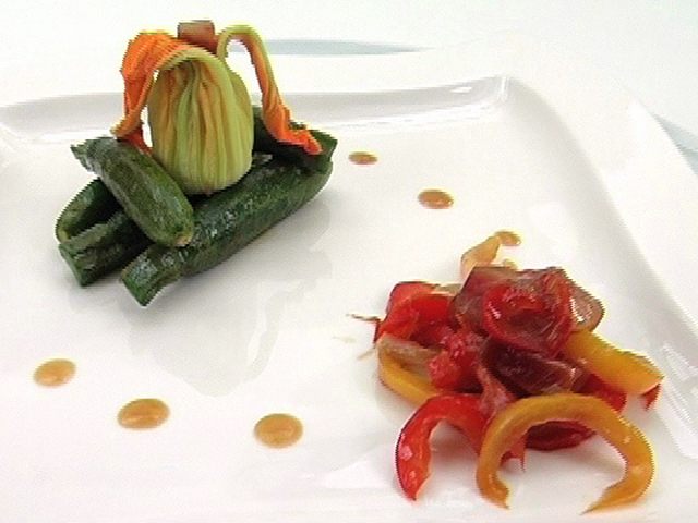 Закуска из молодых цукини с нежным устричным соусом.Состав:цукини — 5 штук;ветчина — 30 гр;кунжутное масло — 1 столовая ложка;оливковое масло — 1 столовая ложка;кукурузная мука — 1 столовая ложка;устричный соус — 1 столовая ложка;овощной бульон — 100 гр;сахар — 1 чайная ложка;соевый соус — 1 чайная ложка;лук — 1/2 штуки;сладкий перец — 1 штука.