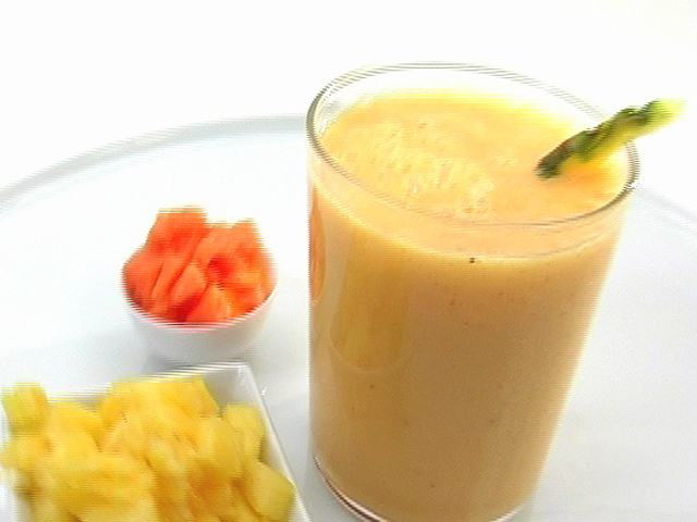 Тропический завтрак для всех любителей фруктов.Состав:папайя — 50 гр;ананас — 150 гр;манго — 50 гр;соевое молоко — 1/2 стакана;апельсиновый сок — 1 стакана;банан — 1 штука.