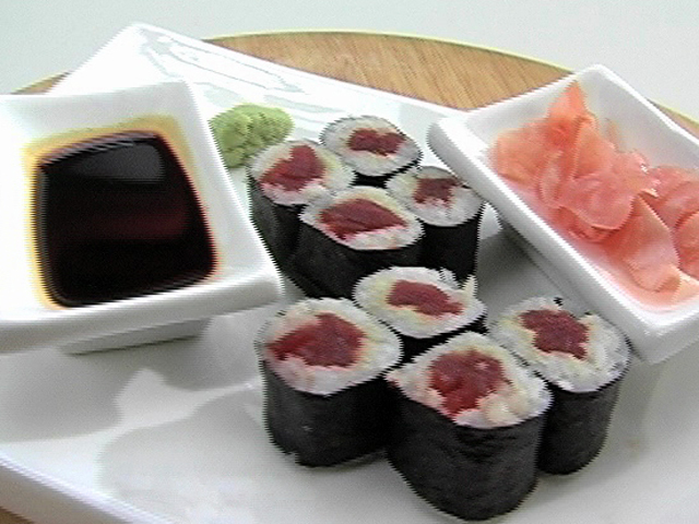 Ролл «Тэка-маки» из тунца.Состав:тунец — 1 кусочек;нори — 1/2 листа;рис — 50 гр;васаби — по вкусу.